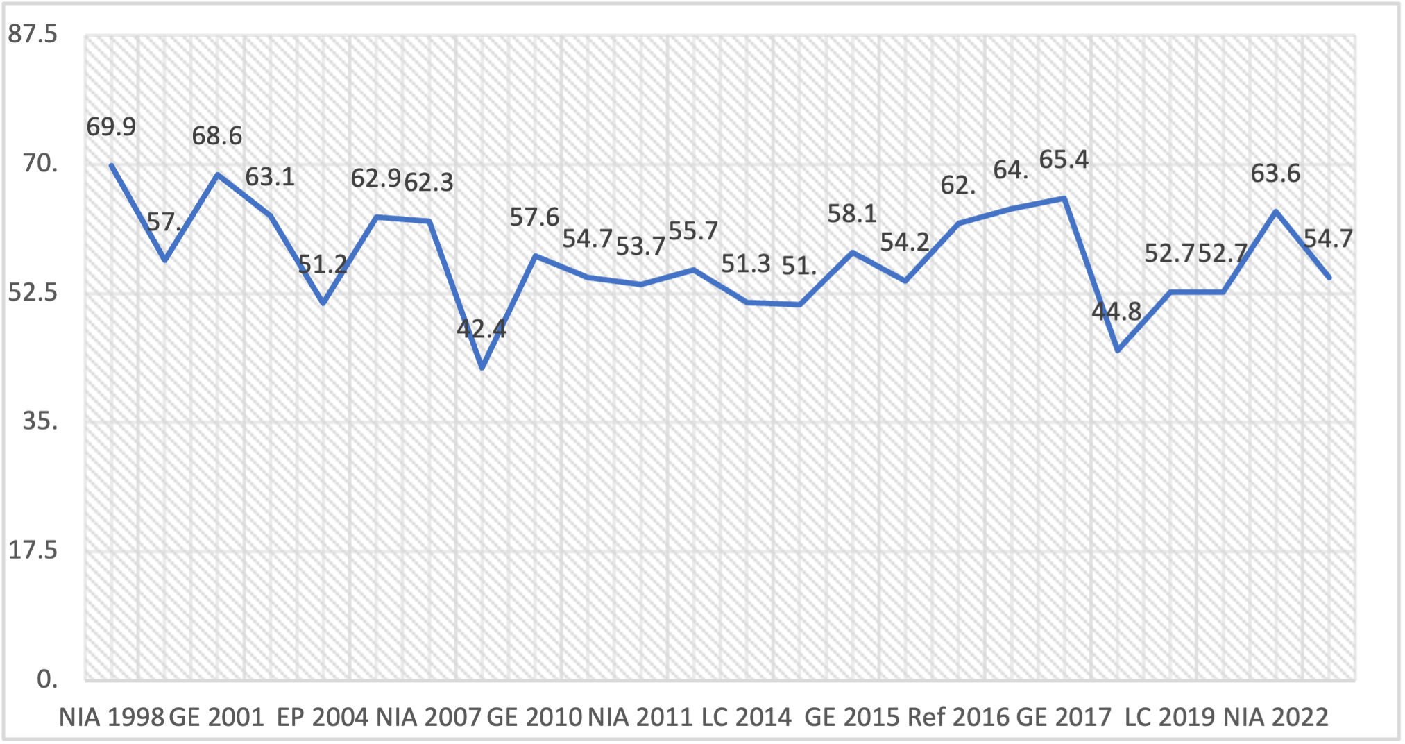 Figure 2: Turnout in NI elections and referendums since 1998. Note that there are different electoral systems at play, with General Elections being First Past the Post and the others using the Single Transferable Vote system (NIA is Northern Ireland Assembly elections; EP is European Parliament elections; GE is UK General Election; Ref is Referendum; LC is Local Council elections)