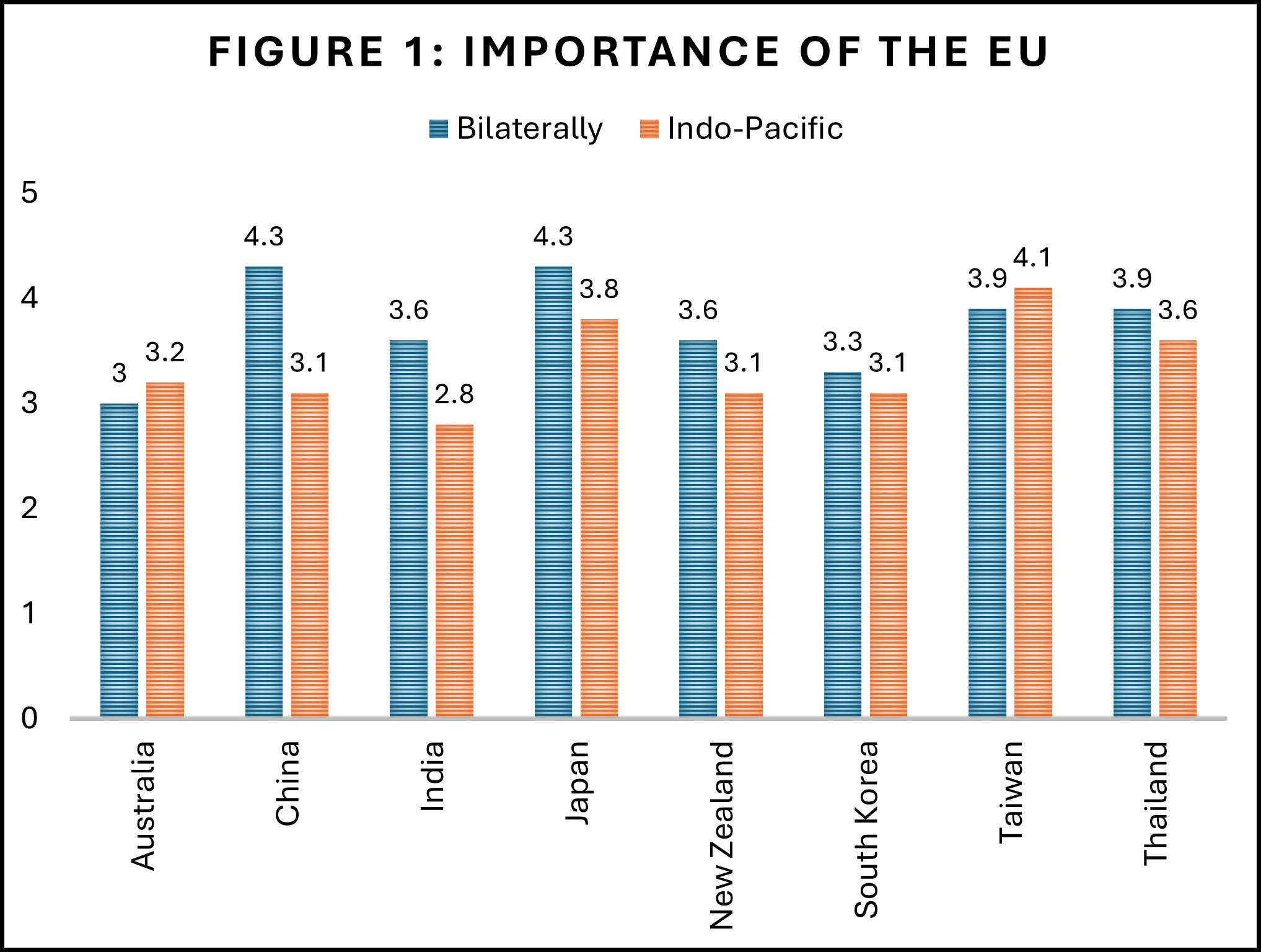 Regarding the importance of the EU to the broader Indo-Pacific region, key informants generally rated it as less significant than in bilateral contexts. Only Australia and Taiwan assigned higher scores to the EU’s role in the Indo-Pacific overall than they did for their bilateral relationships. In particular, Taiwanese key informants judged the EU as being highly important due to perceived alignment on issues such as semiconductor supply chains and a desire for a green energy transition. In contrast, Indian key informants were the most skeptical, citing the EU’s limited foreign policy capabilities—such as its lack of legal competence in this area—and a perceived lack of internal unity as constraints on its regional influence.