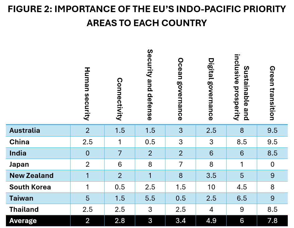 Key informants were then asked to comment on the importance of each of the EU’s seven priority areas of its Indo-Pacific Strategy to their country. Using a scale of 0 being irrelevant and 10 being crucial, the data demonstrated that there is significant diversity of opinion across the Indo-Pacific. Green transition scored the highest in terms of importance—except for Japan, where it only scored a zero—and was deemed an area where the EU could have a significant impact. The priority areas of sustainable and inclusive prosperity, digital governance, and ocean governance (in descending importance) were deemed very important to some countries while less so to others. Security and defense were easily the most talked about priority area in the interviews due to the rising geopolitical tension in the Indo-Pacific. Japan and, to a lesser extent Taiwan, were the only countries that saw the EU as having a role while others were far less optimistic. A common attitude expressed across all the countries (even in the majority of the countries where it was deemed a 3 in importance) was that, while the EU had the potential to make an impact in security and defense, its efforts to have an impact in this area would continue to be inhibited by the need for unanimity amongst all 27 member states when making critical foreign policy decisions. Whether the EU could gain the necessary strategic autonomy to become a more relevant Indo-Pacific actor in security and defense was quite polarizing, with optimistic and pessimistic camps identifiable in the data.
