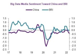 At the same time, negative sentiment about the Belt and Road Initiative, and China more generally, has been growing. This downward trend in China’s image has been further accentuated during the pandemic and is most clear among developed economies, as shown in a survey conducted by the Pew Research Center. In the same vein, the 2021 annual opinion survey conducted by ISEAS points to the same phenomenon within Southeast Asia. Beyond general surveys, my own analysis of local and international media in a large number of countries, using the big data media platform GDELT, shows a severely worsening trend in China’s image during the pandemic. The same is true for the international image of the BRI, although less intensively than for China as a whole (Figure 2).