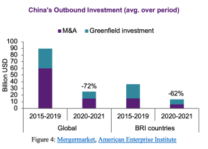 Looking at the evolution of Chinese investment overseas during the pandemic, per data from the American Enterprise Institute and Mergermarket, the slowdown in China’s overseas financing in BRI countries is very clear. China’s investment overseas sometimes includes control, through foreign direct investment (FDI), acquisitions of companies, or greenfield investment, where companies build plants from scratch. Most of the time, though, China only lends and does not hold equity, especially through project finance. For the former, Figure 4 shows that China’s outward FDI, whether in the form of mergers and acquisitions (M&A) or greenfield activity, has plummeted since the pandemic started, with a reduction of 72 percent from the average reached during the period from 2015 to 2019. This is also true for China’s FDI in BRI countries, although the reduction is slightly less intense—62 percent, but from a much lower base.