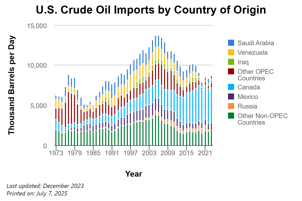Since these major disruptions, the oil market has changed in terms of global supply growth. Four countries in the Americas—the United States, Guyana, Canada, and Brazil—have the capacity to partially offset near-term voluntary production cuts from OPEC+ nations. In 2018, the United States became the world’s greatest oil producer. Concurrently, US imports of Gulf oil have fallen by 1.29 million barrels per day (56.8 percent reduction) in the last 20 years, while imports from Canada have increased by 2.4 million barrels per day (121.8 per cent increase) over the same time period.