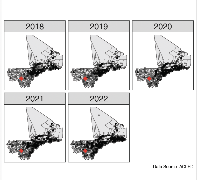 Figure 3: Geographical distribution of political violence 2018-2022. Source: ACLED. Black dots represent violent incidents, the red diamond locates the capital Bamako