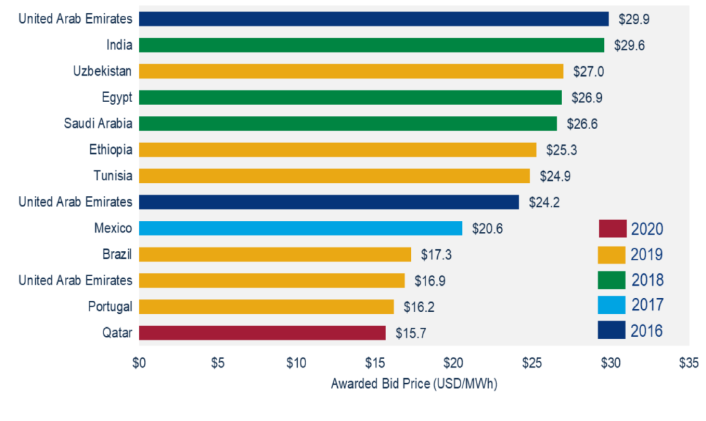 Between 2016 and 2019, the global record low tariff for a utility-scale solar PV project was broken seven times—in the United States, Chile, the United Arab Emirates, Saudi Arabia, Mexico, and Portugal. In the fall of 2017, utility-scale project bids in Saudi Arabia and Mexico breached the twenty-dollar per megawatt hour (MWh) threshold for the first time (though the bid in Saudi Arabia was not awarded the project), and now have been joined by projects in Brazil, Portugal, and Qatar. Eleven countries have now attracted thirteen awarded solar bids below thirty dollars per MWh (Figure 1), far cheaper than average ranges for coal (-2 per MWh) or combined-cycle gas (-68 per MWh). This recent phenomenon of ultra-low bids, intensifying frequency and regularity of solicitations for PV projects, and a steepening learning curve has incentivized rigorous technological innovation and reductions in the cost of components, financing, and operations and maintenance for utility-scale projects.